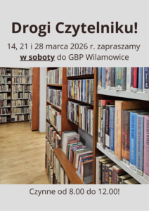 04 lis2025 10 listopada 2025 r. Gminna Biblioteka Publiczna Wilamowice oraz placówki filialne będą nieczynne. Dodane przez GBP | Kategoria: Bez kategorii Czytaj więcej >>